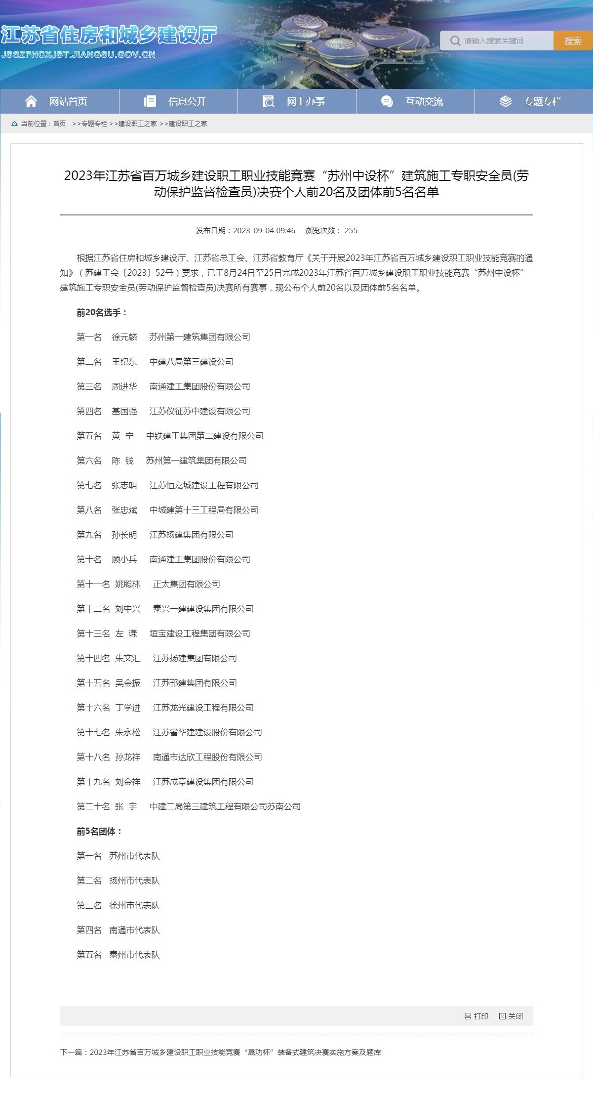 我司基國強同志于8月24日至25日參加由江蘇省住房和城鄉(xiāng)建設(shè)廳、江蘇省總工會、江蘇省教育廳聯(lián)合舉行的2023年江蘇省百萬城鄉(xiāng)建設(shè)職工職業(yè)技能競賽“蘇州中設(shè)杯”建筑施工專職安全員(勞動保護監(jiān)督檢查員)決賽中,取得第四名的優(yōu)異成績,并獲得“省住房城鄉(xiāng)建設(shè)系統(tǒng)技能標(biāo)兵”稱號!特此祝賀!